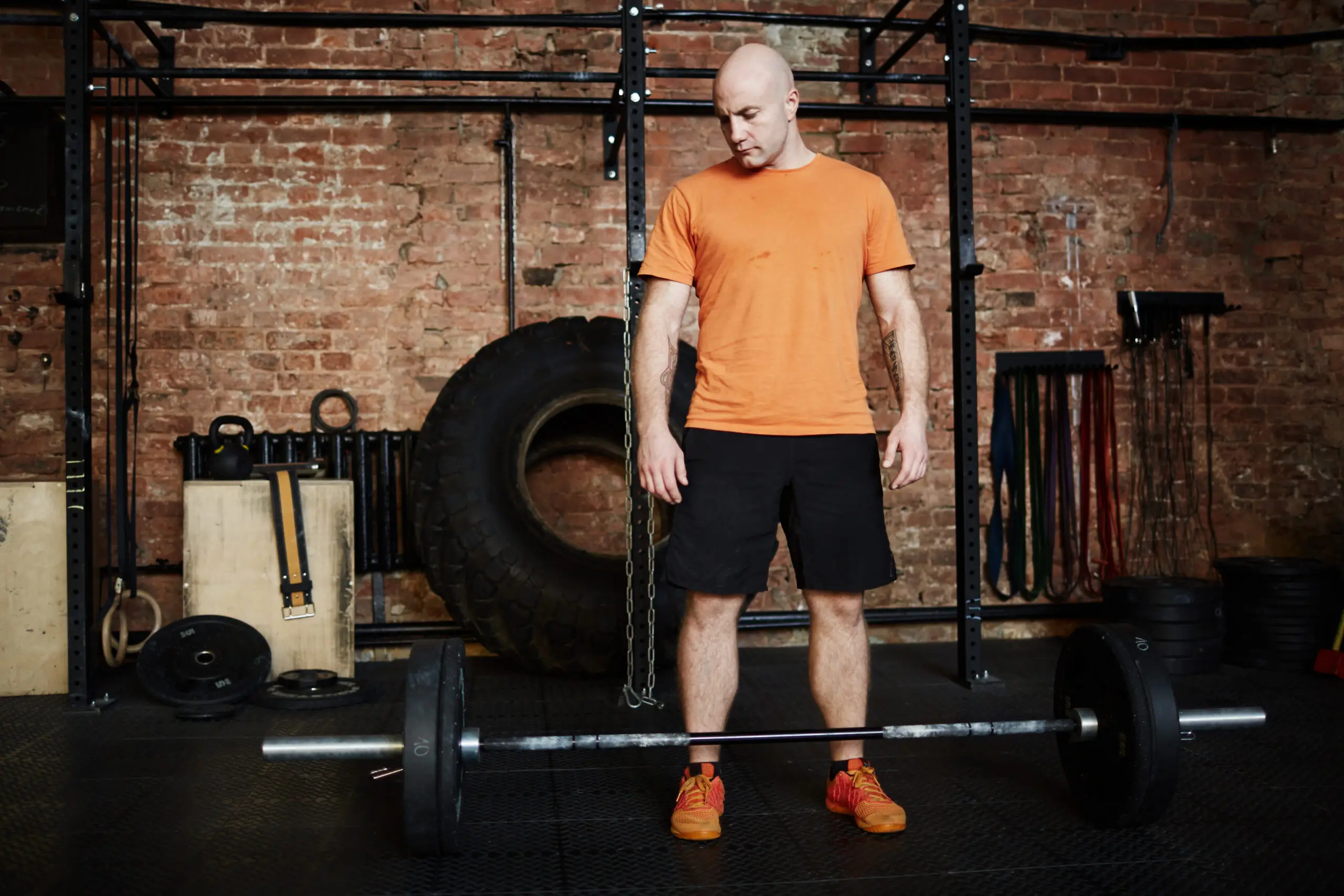 Full-length portrait of handsome fit man looking at barbell with concentration while standing in modern gym